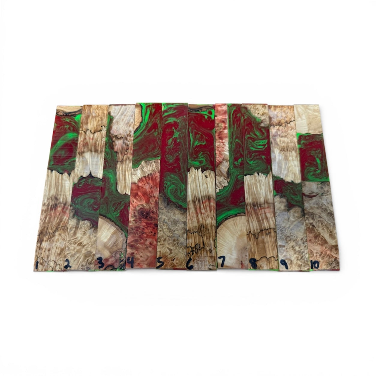 These hybrid pen blanks are made from stabilized spalted boxelder burl, urethane resin and high quality pigments