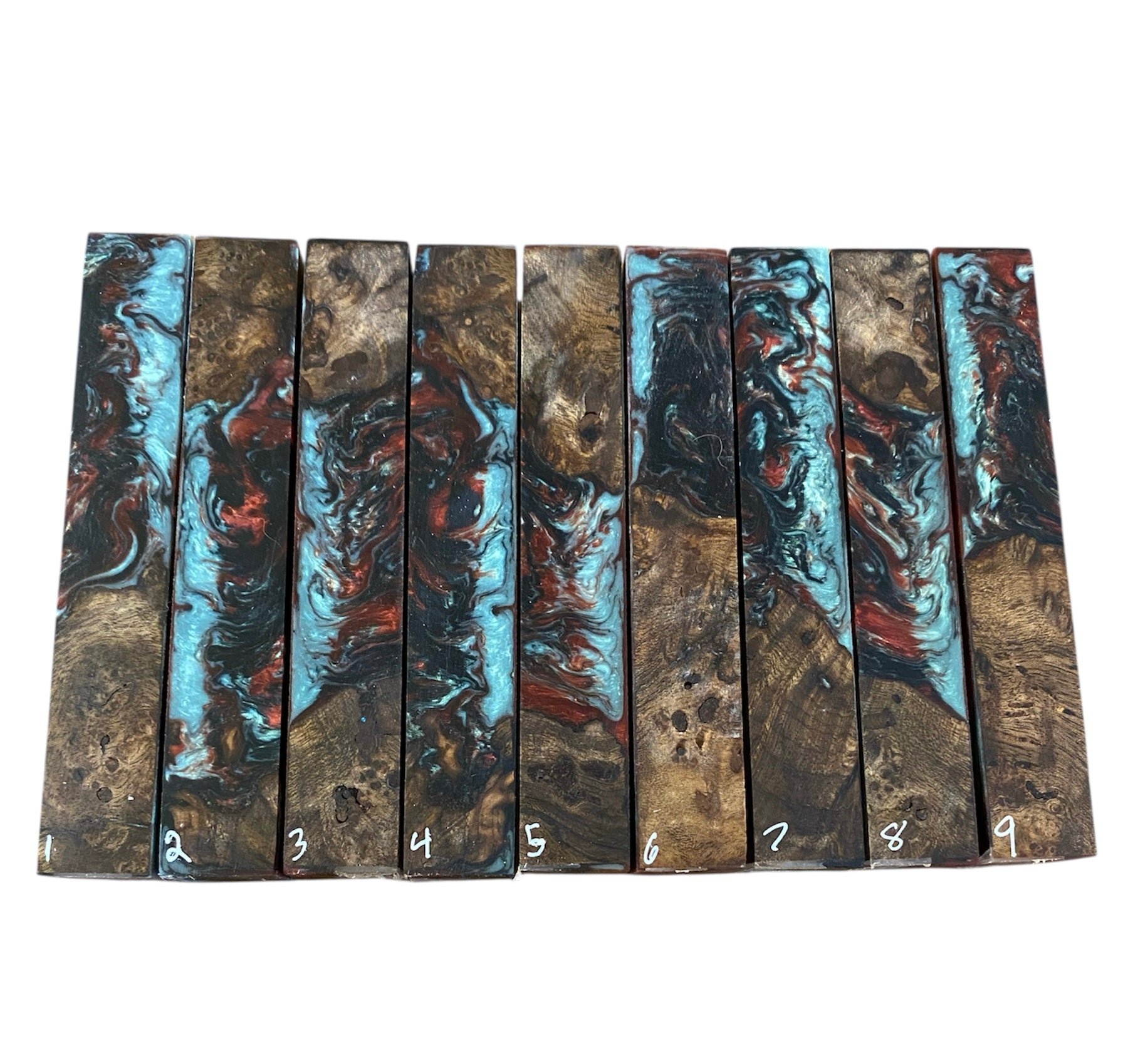 Made from stabilized Myrtle wood burl, Urethane resin and high quality pigments, pressure cast to 60psi