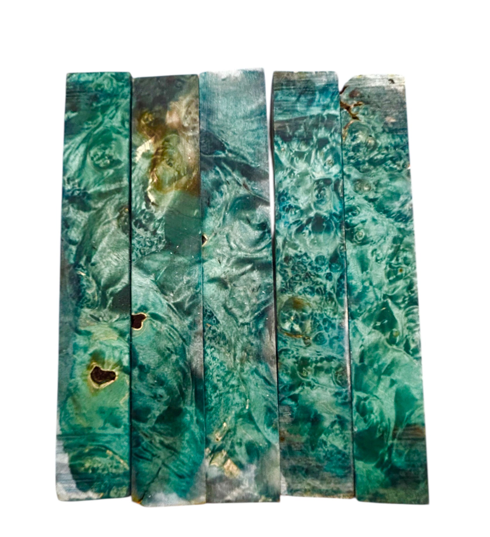 Green dye stabilized box elder burl, photo shows multiple for grain variation