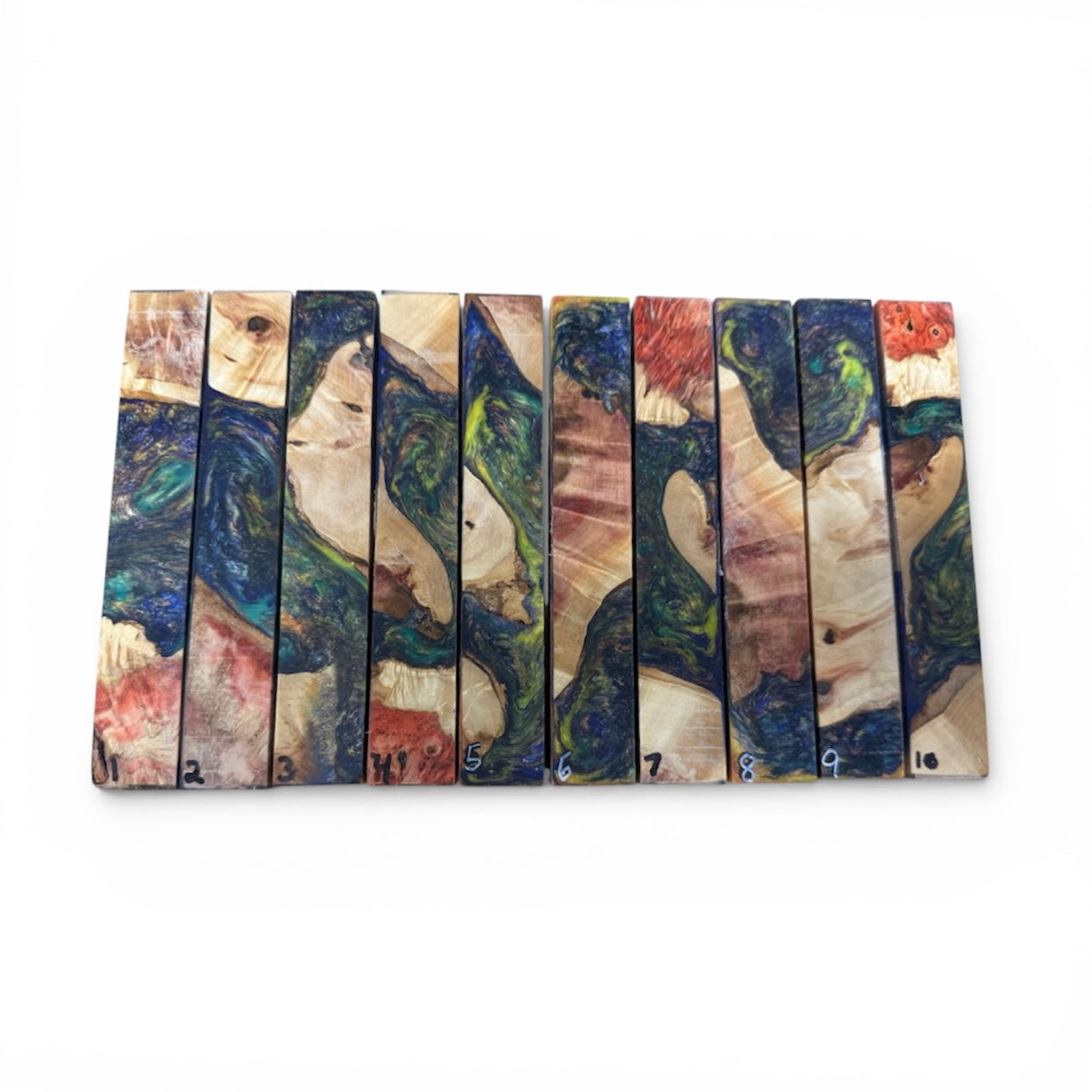 These hybrid pen blanks are made from stabilized box elder burl (some flame to it), urethane resin and high quality pigments