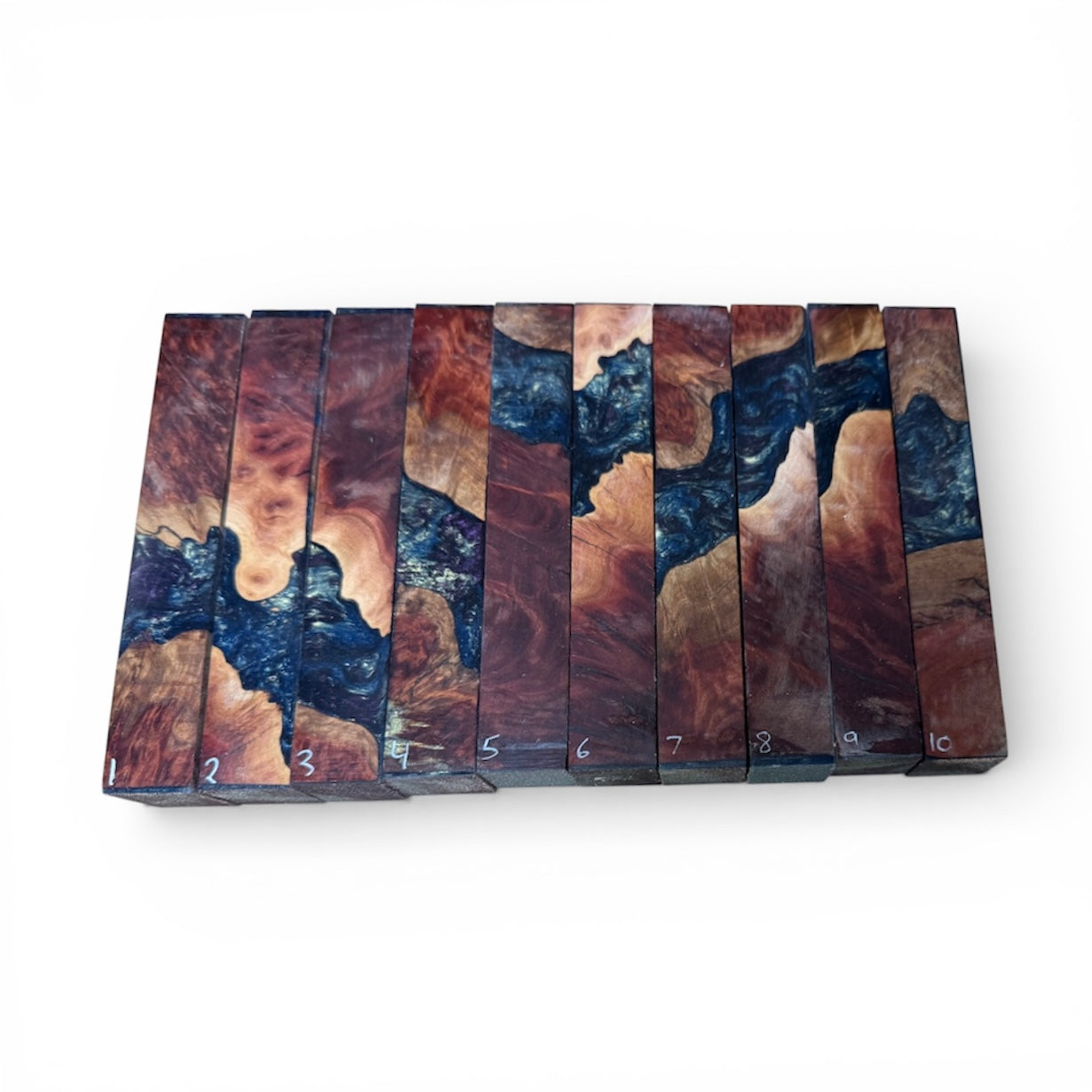 These hybrid pen blanks are made from stabilized red mallee burl, urethane resin and high quality pigments